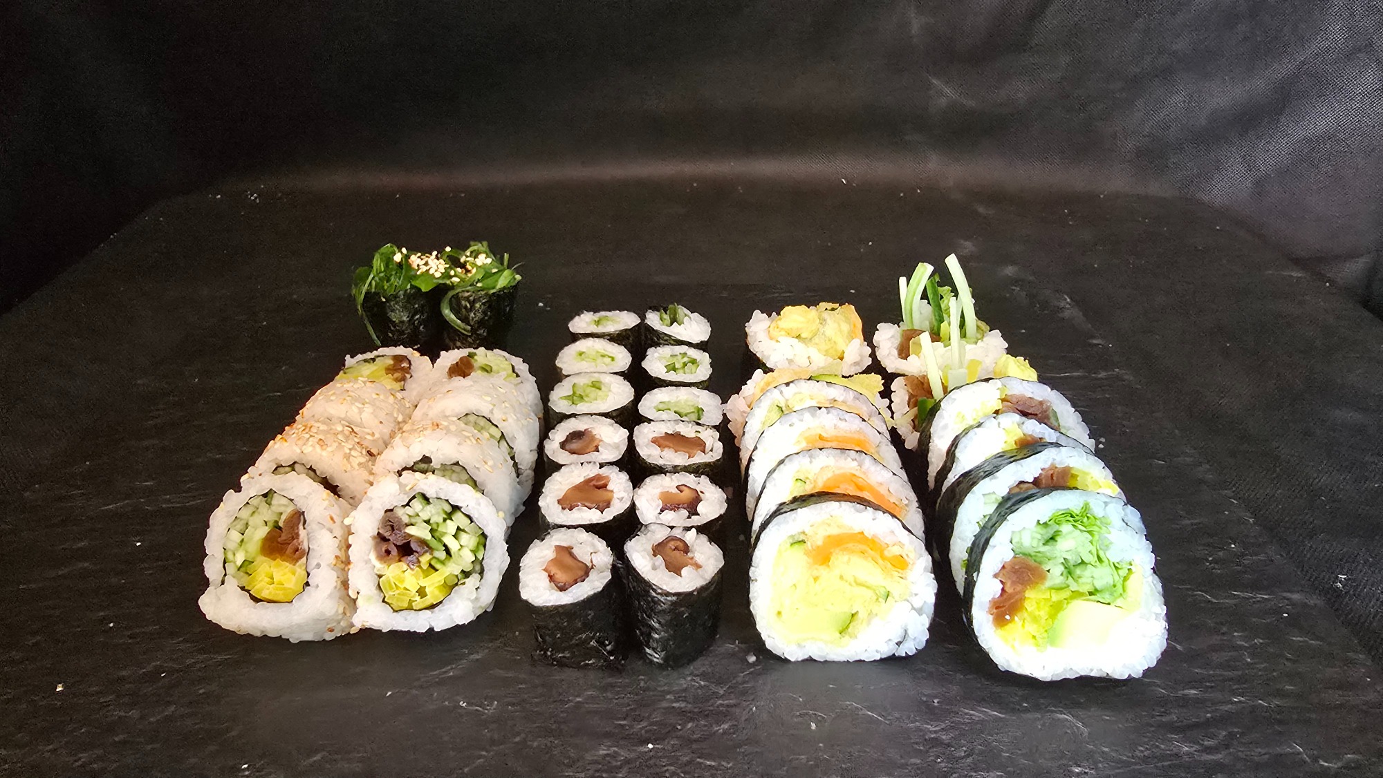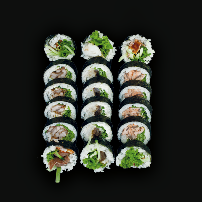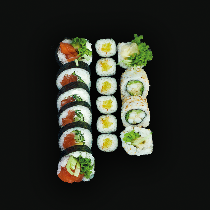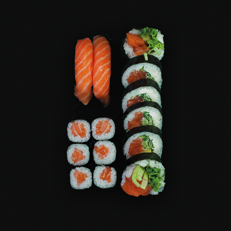 hosomaki z avocado (4 szt.), hosomaki z ogórkiem (4 szt.), pieczony łosoś (8 szt.)