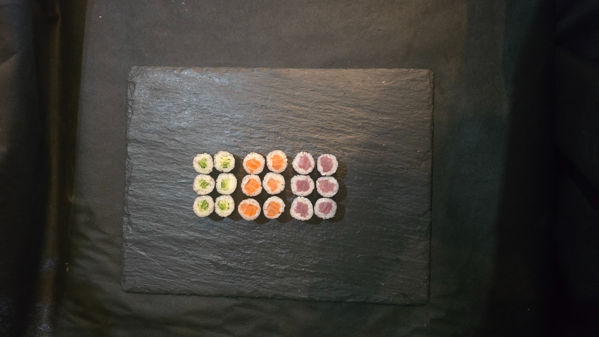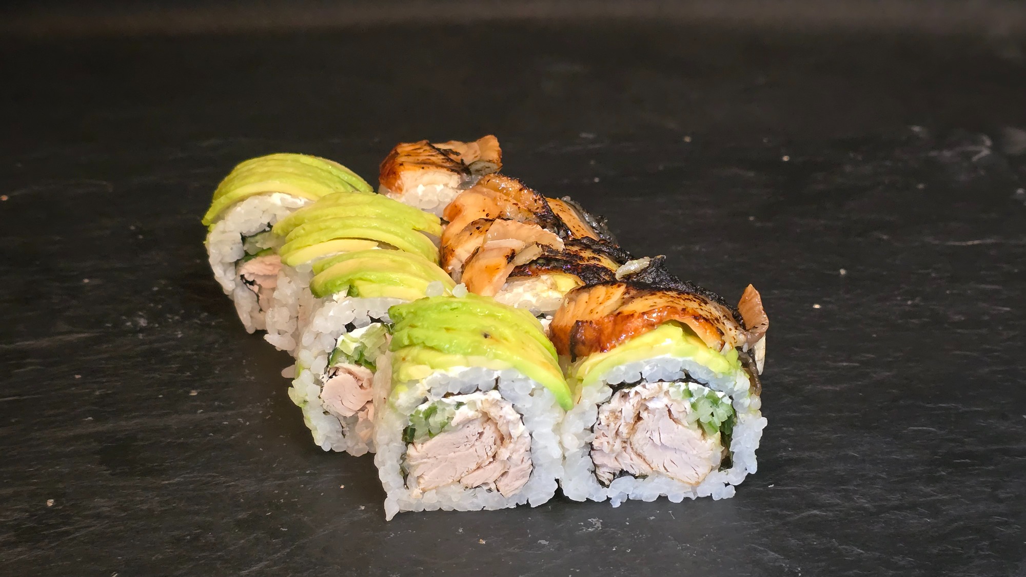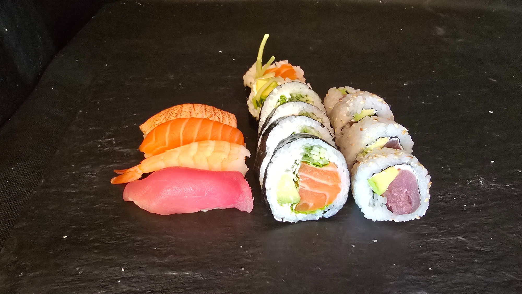 hosomaki z avocado (4 szt.), hosomaki z ogórkiem (4 szt.), pieczony łosoś (8 szt.)