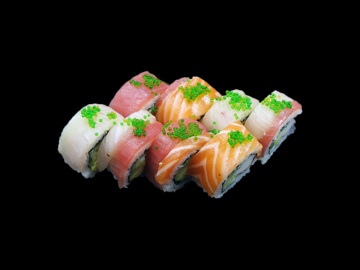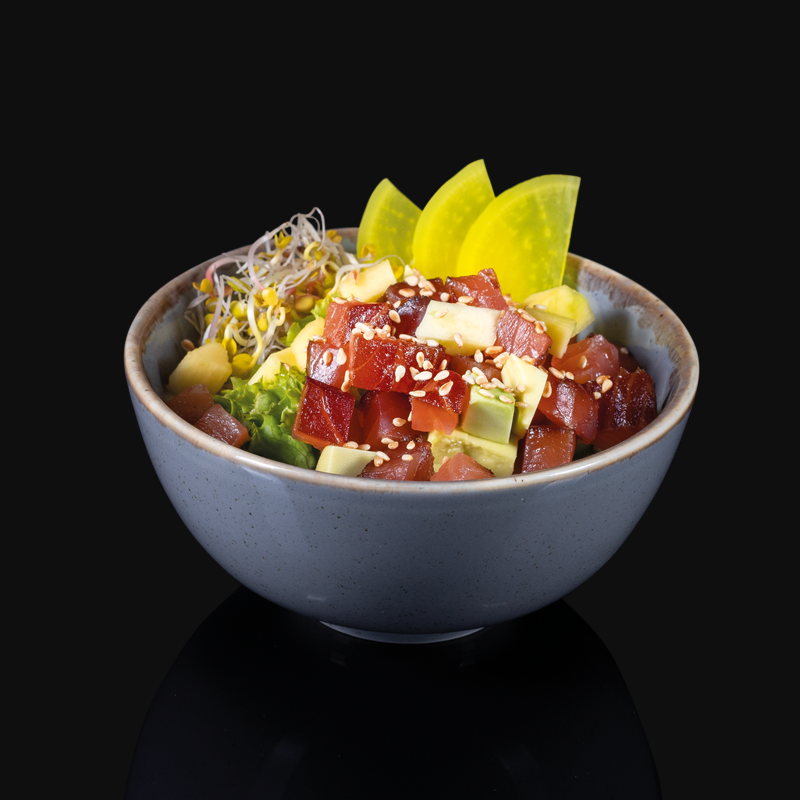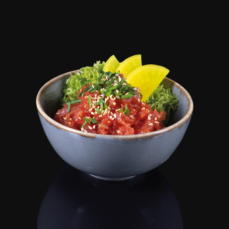 Kompozycja świeżych składników podana na ryżu z sosem do wyboru/sos kabayaki/majonez ostry/majonez wasabi/kolendrowy/tamaryndowy