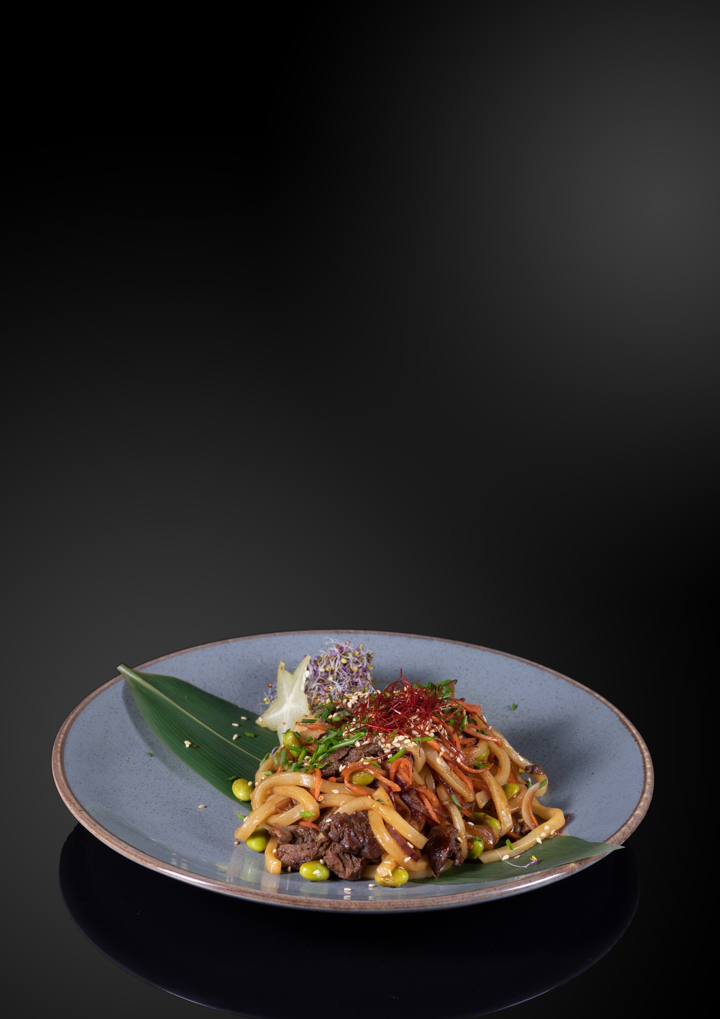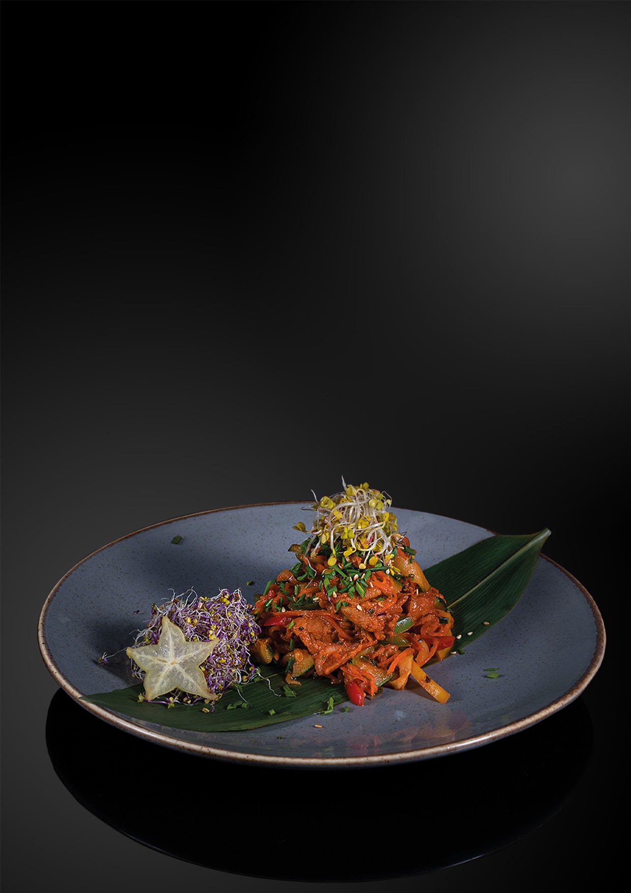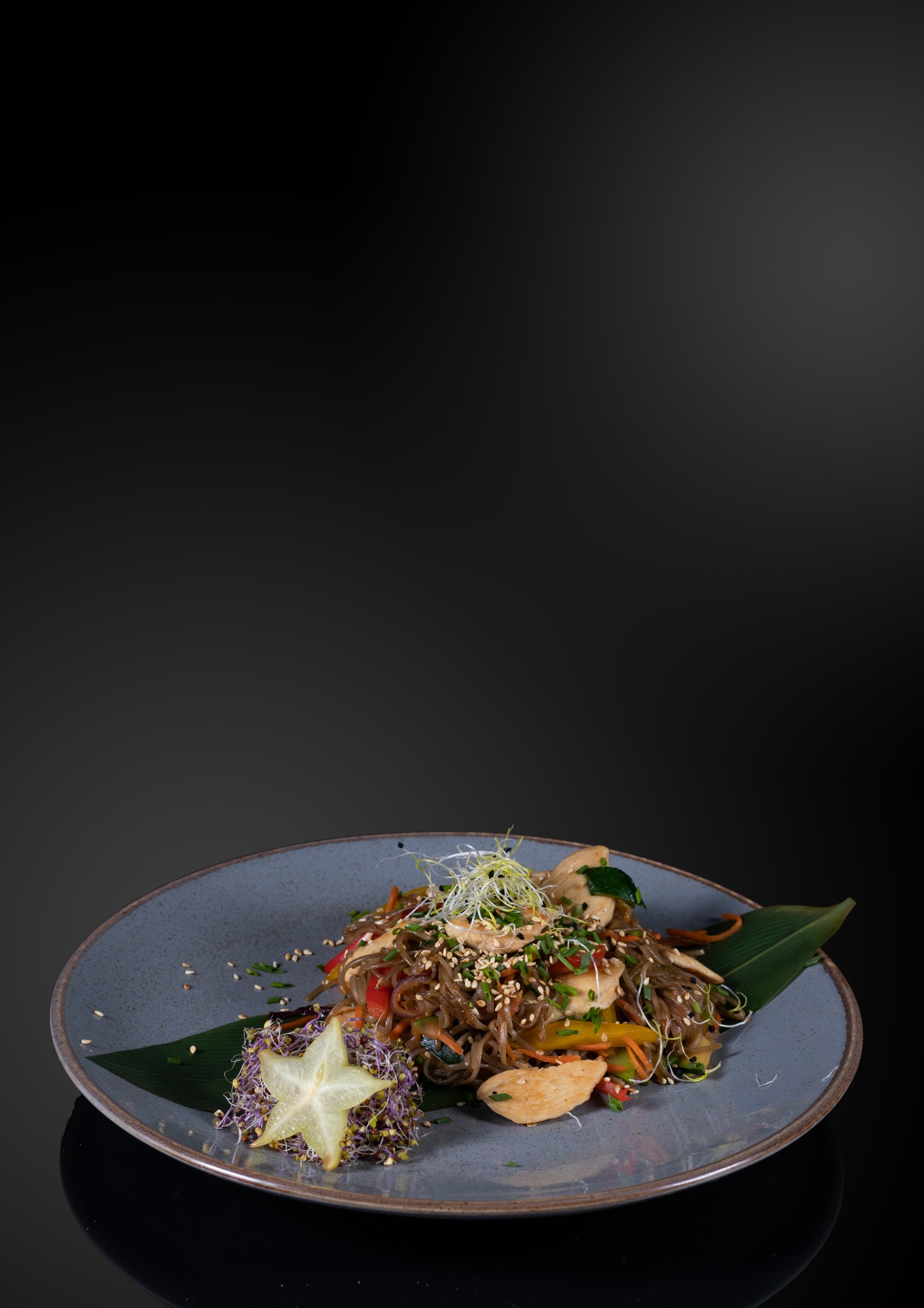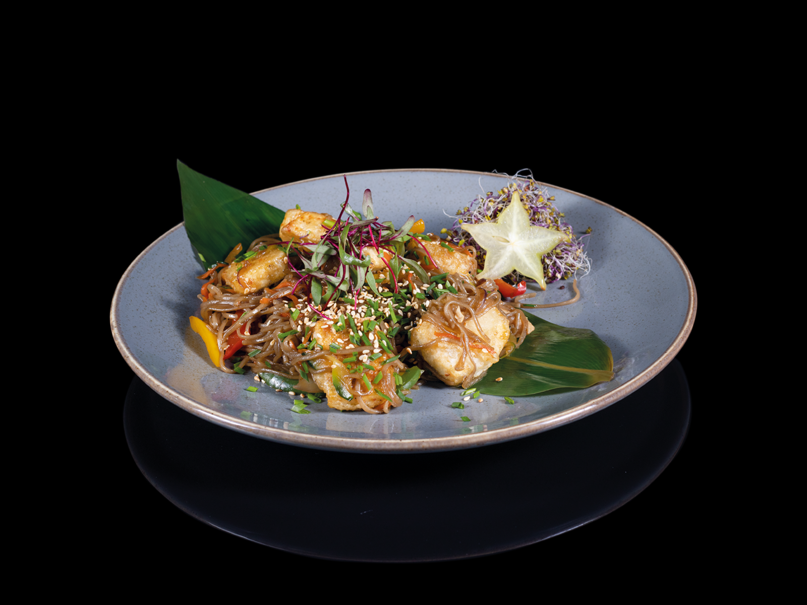 Makaron gryczany ze smażonymi warzywami oraz kawałkami tofu.