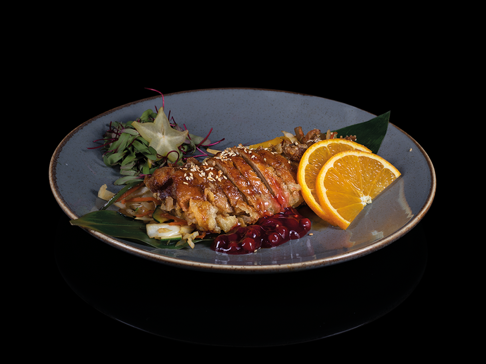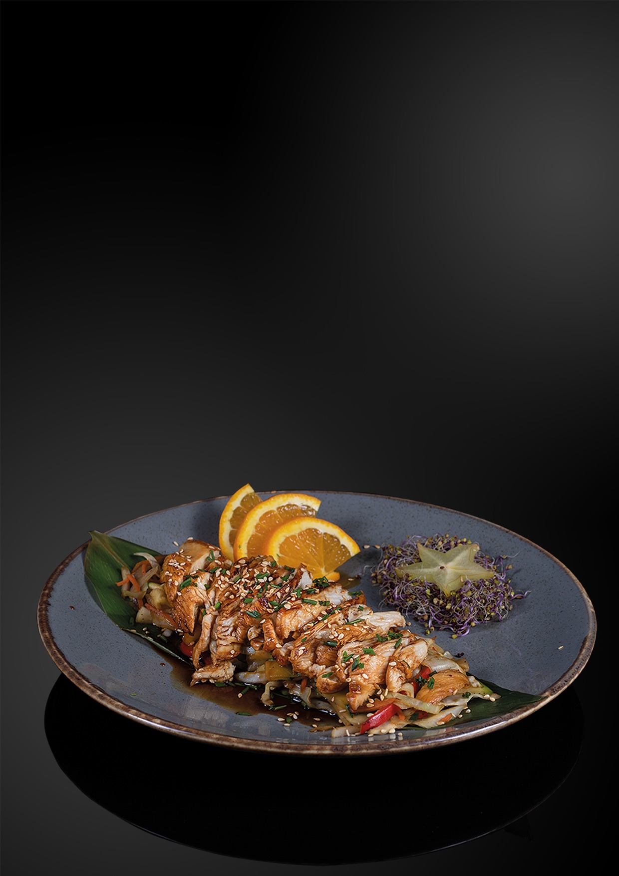 Delikatny kawałek kurczaka (120 g.) ze smażonymi warzywami oraz sosem Teryaki. Całość podawana z ryżem.