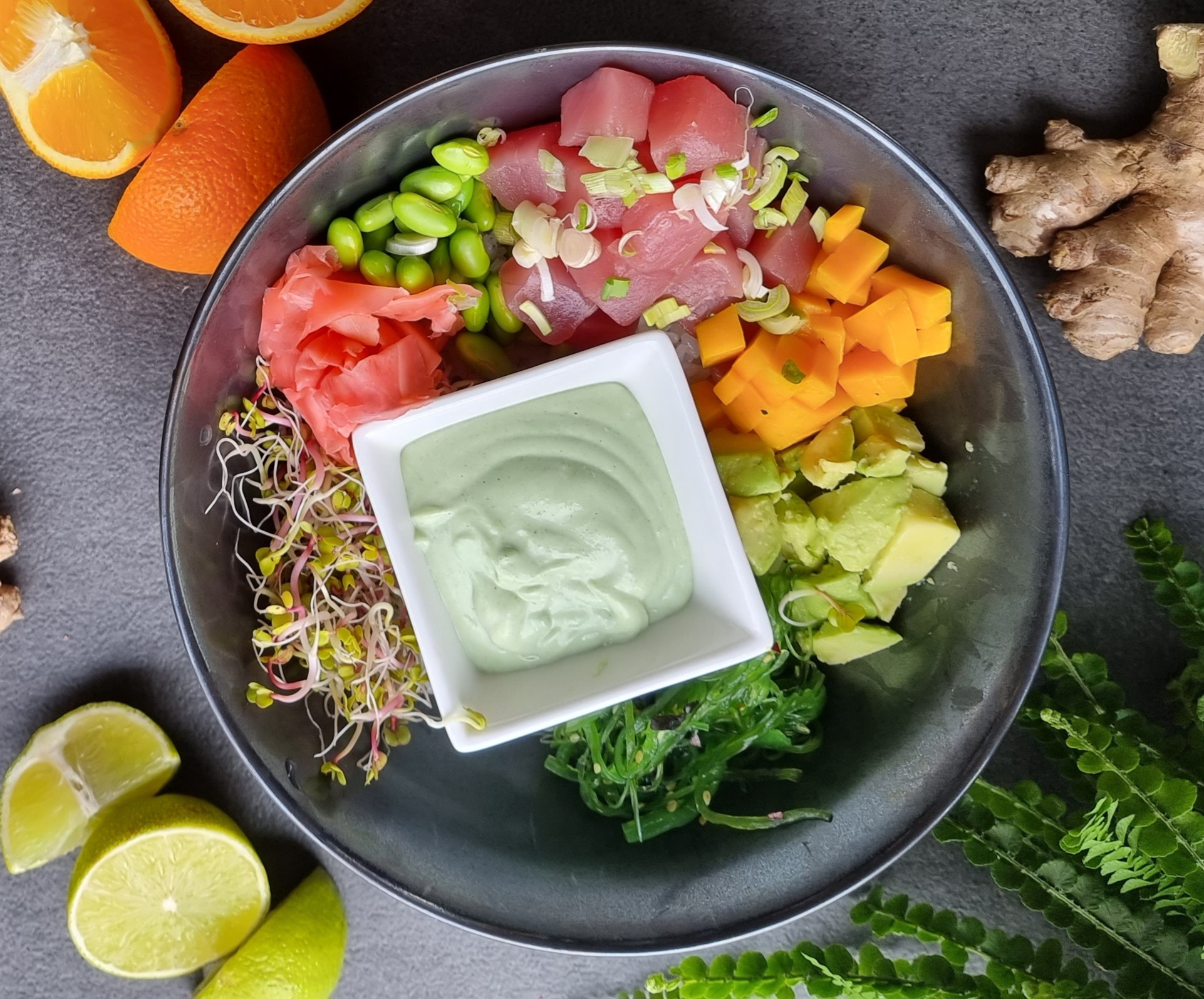 łosoś /awokado/mango/edamame/imbir marynowany/kiełki/dymka/sezam ryż/goma wakame/sos do wyboru -